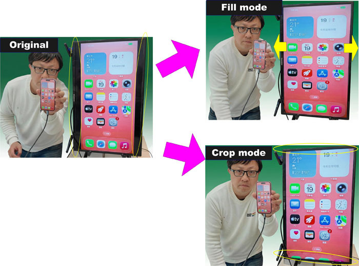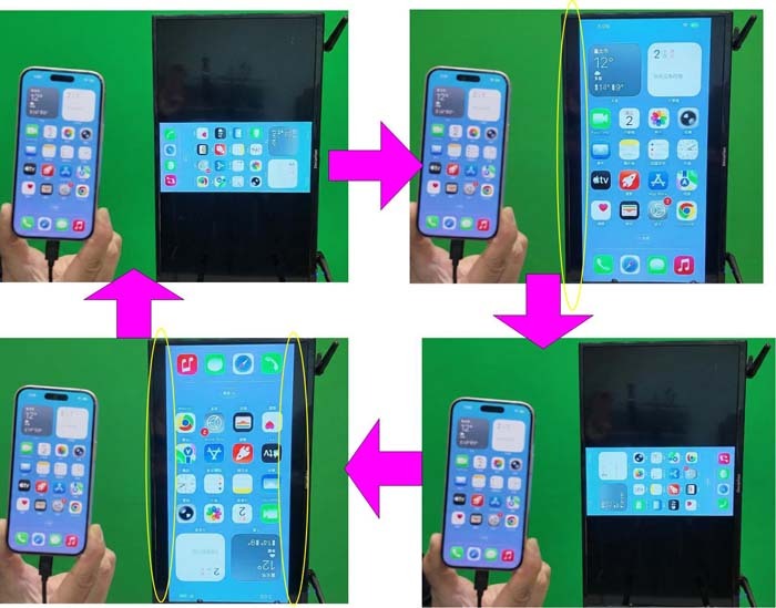 For mirroring a smartphone’s vertical screen to a TV, we offer three display modes.