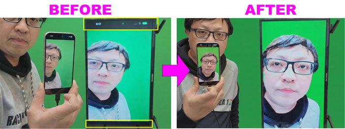 How can a 20:9 smartphone display be shown in full screen on tv or atem mini pro without add black blank